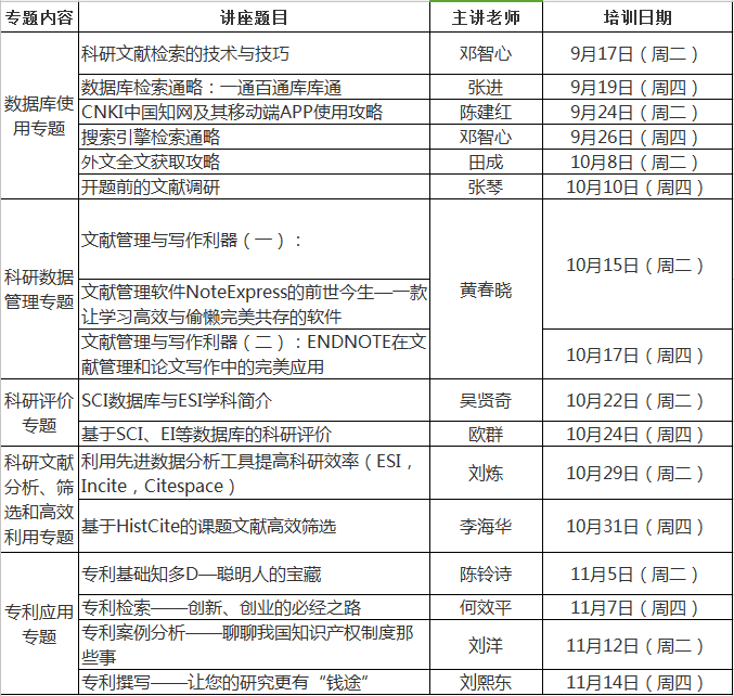 預約培訓:若以上時間無法參與學習,院系班級、科研團隊也可以根據(jù)自己的需要,擬定需要培訓的內容,與圖書館培訓主管老師預約開展所需內容的培訓。