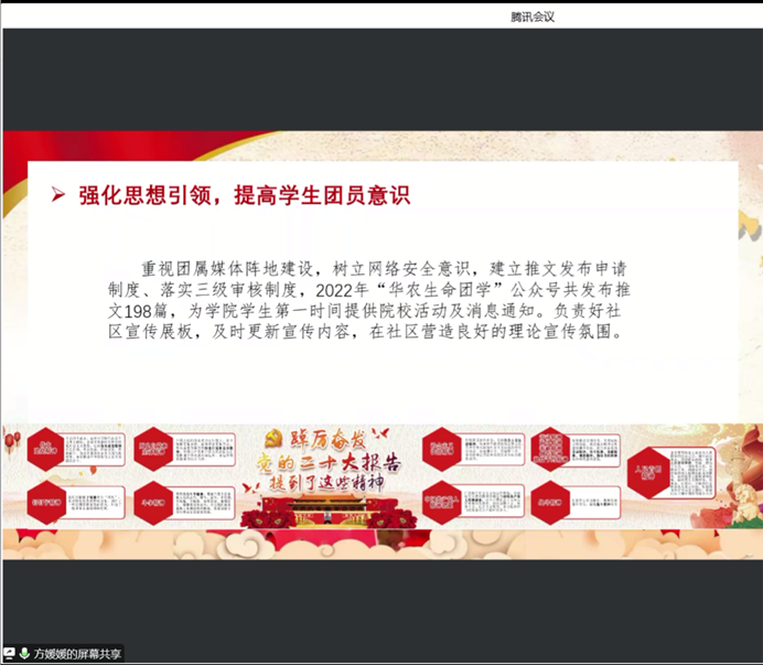 為總結(jié)團(tuán)委各部門本學(xué)期工作,及做好下學(xué)期工作規(guī)劃,1月9日下午,生命科學(xué)學(xué)院團(tuán)委于騰訊會(huì)議平臺(tái)召開(kāi)第二十五屆第二任全委全干會(huì)暨團(tuán)支書會(huì)議。本次大會(huì)由團(tuán)委副書記鄧芷晴主持,與會(huì)人員有團(tuán)委書記方媛媛、各團(tuán)委副書記、秘書長(zhǎng)、各部門部長(zhǎng)及全體干事、學(xué)院團(tuán)支書等。