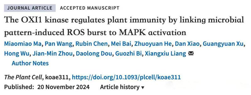 近期,華南農(nóng)業(yè)大學(xué)生命科學(xué)學(xué)院梁祥修實(shí)驗(yàn)室在Plant Cell期刊發(fā)表了題為“The OXI1 kinase regulates plant immunity by linking microbial pattern-induced ROS burst to MAPK activation”的研究論文。該研究發(fā)現(xiàn)一個(gè)已知受到ROS信號(hào)激活的蛋白激酶OXI1與LYK5、CERK1互作,是植物免疫受體復(fù)合體新組分。在oxi1突變體中,chitin誘導(dǎo)的MAPK激活和ROS爆發(fā)比野生型降低。進(jìn)一步研究發(fā)現(xiàn),OXI1與識(shí)別不同微生物分子模式的多種免疫受體都存在蛋白互作,且不同微生物分子模式誘導(dǎo)的MAPK激活在oxi1突變體種都顯著降低。與之一致的是,oxi1突變體對(duì)真菌、細(xì)菌、卵菌病害的抗病性也都顯著降低。