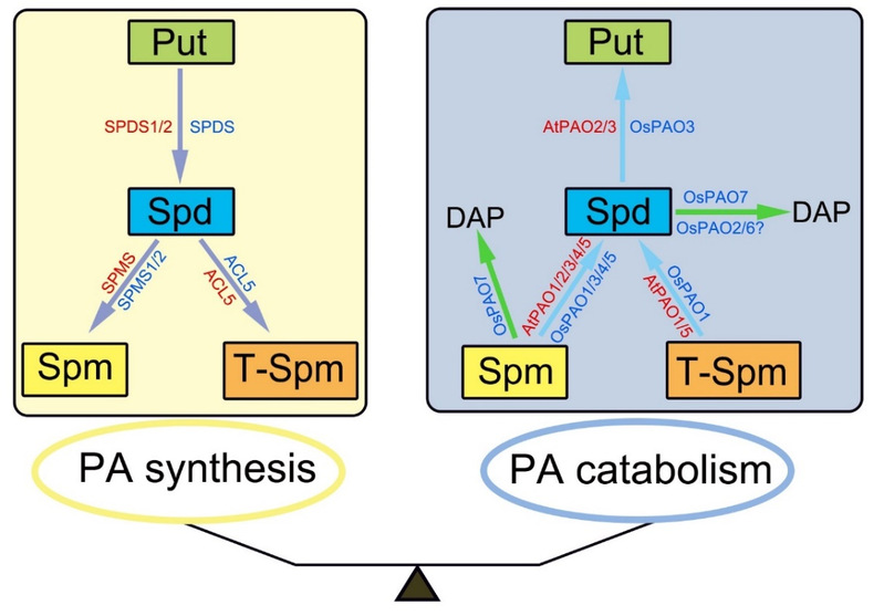 多胺穩(wěn)態(tài)(PA balance)的維持對植物生長發(fā)育和抗逆性具有至關(guān)重要的作用。植物體內(nèi)多胺穩(wěn)態(tài)主要通過其合成(PA biosynthesis)與代謝途徑(PA catabolism)的動態(tài)調(diào)節(jié)來維持(圖1)。