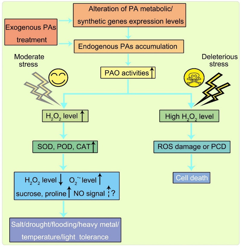 外源多胺處理可以增加內(nèi)源多胺的積累,進而影響多胺氧化酶(PAO)的活性。多胺在PAO的作用下會產(chǎn)生H2O2,后者作為重要的信號分子參與植物的耐鹽、耐旱、耐水淹、耐重金屬、耐高溫和低溫、及高光強等抗性反應(yīng)過程。同時,H2O2是一把“雙刃劍”,它的過度積累可能會導(dǎo)致活性氧大爆發(fā)ROS,進而觸發(fā)程序性細胞死亡(PCD)等過程,嚴(yán)重時會造成細胞死亡,傷害植物(圖2)。