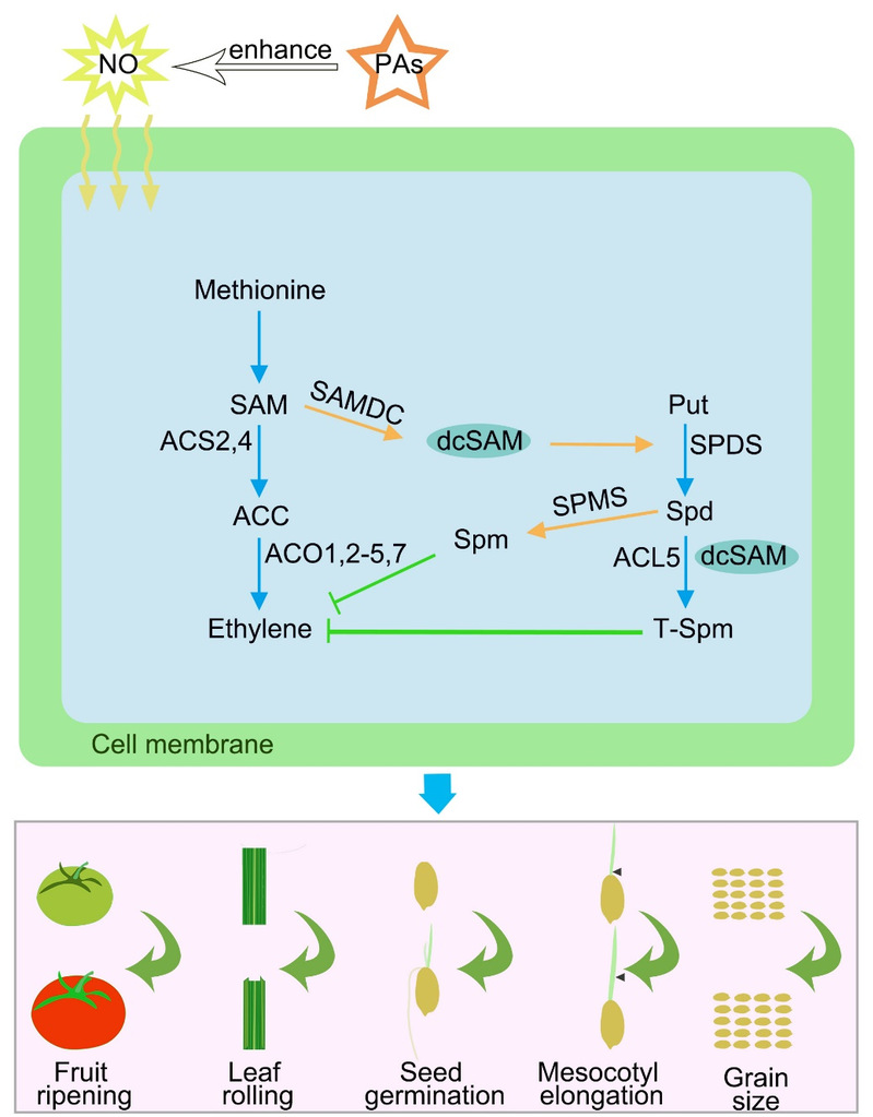 多胺可與乙烯、NO等信號分子互作,調(diào)控包括果實發(fā)育、葉片發(fā)育、種子萌發(fā)、胚軸伸長、籽粒大小等植物生長發(fā)育過程(圖3)。