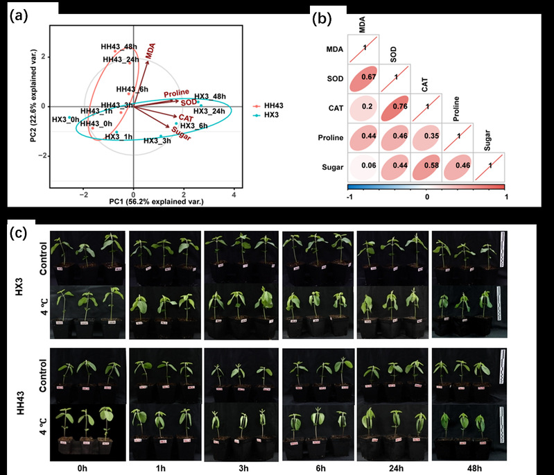 研究團隊通過植物形態(tài)、生理生化指標以及轉(zhuǎn)錄組與蛋白質(zhì)組多組學綜合分析,揭示了兩個大豆品種在低溫脅迫下的差異性應答機制。研究對象為我國南北兩個代表性大豆品種:來自東北地區(qū)的黑河43(HH43)和來自華南地區(qū)的華夏3號(HX3)。雖然傳統(tǒng)認知上北方品種應更耐寒,但實驗卻發(fā)現(xiàn),HX3在4℃低溫處理下的表現(xiàn)更為出色,不僅葉片萎蔫延遲,且抗氧化能力更強,顯示出顯著的抗寒優(yōu)勢。