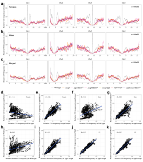 在多個高重組頻率突變體中,研究人員整合約5萬個重組事件,發(fā)現(xiàn)盡管重組頻率顯著提升,CO在染色體尺度上的分布模式仍然保持高度一致,主要富集于染色體遠端區(qū)域,而近著絲粒區(qū)域則保持為重組“冷區(qū)”。更為關(guān)鍵的是,在這些高重組背景下,雌雄個體之間CO的分布圖譜幾乎完全重合,顯著區(qū)別于野生型中呈現(xiàn)性別特異性差異的CO分布模式(圖3)。