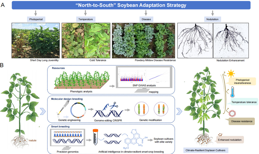 文中還提出實施方案:運用環(huán)境基因型分析,平衡短日照、極端溫度等環(huán)境壓力,識別影響大豆適應(yīng)性的環(huán)境協(xié)變量,建立提升產(chǎn)量穩(wěn)定性與適應(yīng)性的預(yù)測育種框架。針對低緯度地區(qū)改良基因型,借助系統(tǒng)發(fā)育學(xué)法,結(jié)合大豆基因組重測序技術(shù),收集適應(yīng)性性狀數(shù)據(jù)。利用基因組選擇,實現(xiàn)抗逆性預(yù)測、等位基因劑量優(yōu)化、適應(yīng)性圖譜繪制和氣候智能型作物培育等關(guān)鍵技術(shù)突破。通過精準(zhǔn)基因組學(xué)、合成生物學(xué)、轉(zhuǎn)基因和基因編輯育種技術(shù),培育適應(yīng)低緯度環(huán)境的優(yōu)良大豆品種。同時,將人工智能與組學(xué)工具相結(jié)合,加速基因鑒定,助力環(huán)境適應(yīng)型智能大豆育種。此外,實施綜合病害管理策略,開發(fā)高效養(yǎng)分利用的大豆品種,篩選適應(yīng)當(dāng)?shù)氐母鼍约伴_發(fā)細(xì)菌肥料,促進(jìn)生態(tài)平衡和可持續(xù)農(nóng)業(yè)發(fā)展,最終培育出聚合光不敏感、耐溫度脅迫、抗病且固氮效率高的優(yōu)良性狀大豆品種(圖1)。