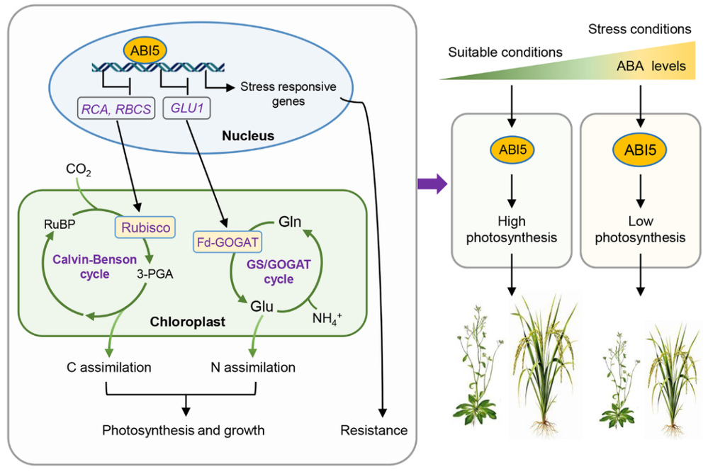 該研究首次揭示了ABA通過ABI5協(xié)同負(fù)調(diào)控碳氮同化、抑制光合作用的新機(jī)制,而降低ABI5表達(dá)可顯著提升擬南芥和水稻光合效率、生物量和產(chǎn)量,為農(nóng)作物增產(chǎn)提供了新的思路。