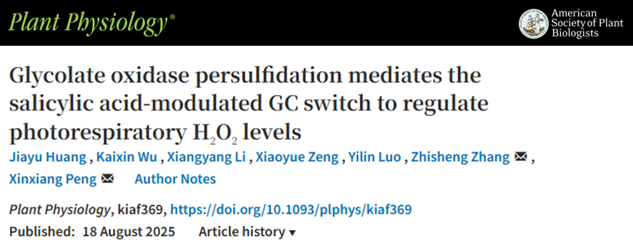 在Plant Physiology發(fā)表題為“Glycolate oxidase persulfidation mediates the salicylic acid-modulated GC switch to regulate photorespiratory H2O2 levels”的論文。團(tuán)隊(duì)前期發(fā)現(xiàn)乙醇酸氧化酶(GLO)與過氧化氫酶(CAT)的互作/解離(簡稱GC開關(guān))調(diào)控光呼吸H2O2水平,此過程受到水楊酸(SA)調(diào)節(jié),但內(nèi)在分子機(jī)制并不清楚。
