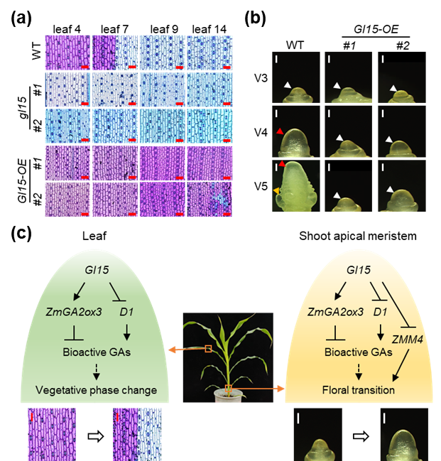 該研究發(fā)現(xiàn),Gl15是中美近現(xiàn)代玉米育種過程中調(diào)控早期營養(yǎng)生長時相轉(zhuǎn)變的關(guān)鍵候選基因,且在育種過程中明顯受到選擇。Hap1是Gl15的早花優(yōu)異單倍型,這一單倍型的選擇頻率在中美近現(xiàn)代玉米育種中逐漸增加。通過基因敲除及過表達(dá)材料的表型分析,研究表明,Gl15不僅抑制營養(yǎng)生長時相轉(zhuǎn)變,還抑制成花轉(zhuǎn)變,從而延遲了玉米的開花。進(jìn)一步研究發(fā)現(xiàn),Gl15能夠在葉片和花序中,通過直接結(jié)合赤霉素(gibberellin, GA)合成基因(DWARF1[D1])和降解基因(ZmGA2ox3)的啟動子,抑制D1的表達(dá),同時激活ZmGA2ox3的轉(zhuǎn)錄活性,從而降低植株體內(nèi)具有生物活性的GA含量,最終導(dǎo)致玉米開花延遲。此外,Gl15還能夠直接轉(zhuǎn)錄抑制花器官發(fā)育基因ZMM4的表達(dá)來延遲玉米成花轉(zhuǎn)變。該研究揭示了Gl15作為雙重開花抑制子的作用,并闡明了Gl15通過降低體內(nèi)GA含量和成花激活基因的表達(dá)來延遲開花,為培育適合不同生態(tài)區(qū)種植的玉米新品種提供了寶貴的基因資源和理論依據(jù)。