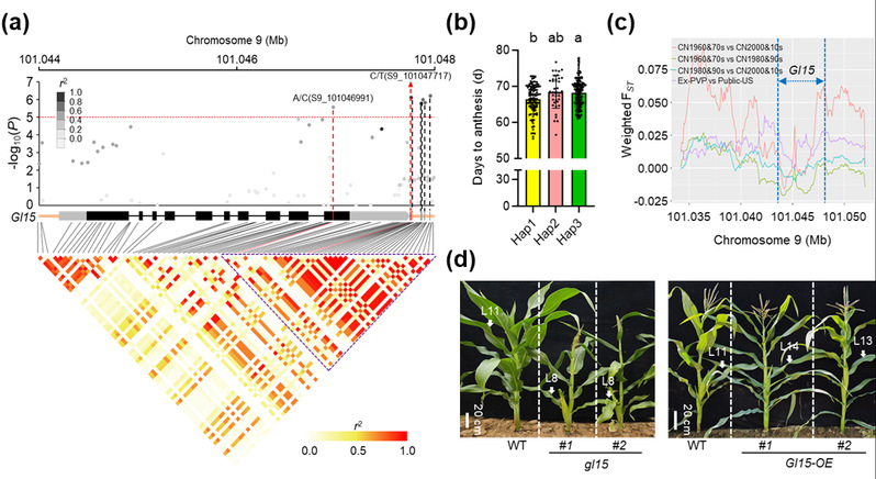 圖1:Gl15是中美近現(xiàn)代玉米育種過程中調(diào)控營養(yǎng)生長時相轉(zhuǎn)變的關(guān)鍵基因,且負(fù)調(diào)控玉米花期。