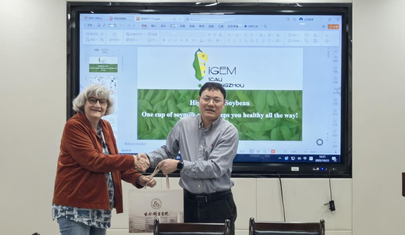 學(xué)術(shù)報(bào)告結(jié)束后,Martin教授應(yīng)王應(yīng)祥院長邀請,前往生命科學(xué)學(xué)院213會議室,聽取了學(xué)院即將參加國際基因工程機(jī)器大賽(iGEM)的學(xué)生團(tuán)隊(duì)項(xiàng)目匯報(bào)。她對團(tuán)隊(duì)的研究思路和實(shí)驗(yàn)設(shè)計(jì)給予肯定,并從科學(xué)問題聚焦、實(shí)驗(yàn)數(shù)據(jù)完善、成果轉(zhuǎn)化潛力等方面提出建設(shè)性改進(jìn)意見,為學(xué)生團(tuán)隊(duì)備賽提供了重要指導(dǎo)。交流尾聲,王應(yīng)祥院長代表學(xué)院向Martin教授贈送紀(jì)念品,以感謝其為師生帶來的前沿學(xué)術(shù)分享與悉心指導(dǎo)。