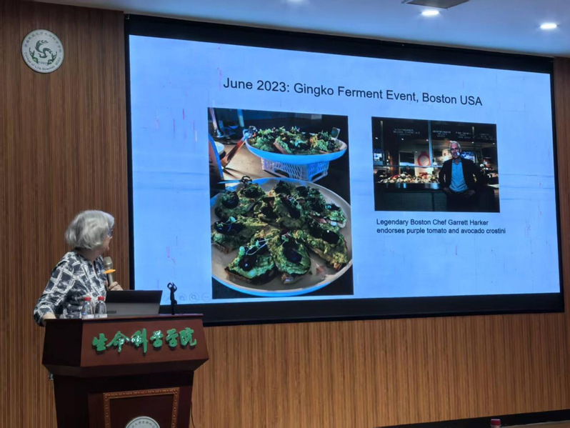 隨后,教授又介紹了顏值與營養(yǎng)并存的“紫色番茄”。她提到,團(tuán)隊(duì)把金魚草里的Del和Ros1兩個基因?qū)敕眩尫逊e累了大量花青素,從里到外變成了紫色。這種紫色番茄的花青素含量最高能到2.83mg/g鮮重,和藍(lán)莓、黑莓差不多,而且親水抗氧化能力比普通番茄翻了3倍。用這種番茄喂實(shí)驗(yàn)小鼠,能顯著延長小鼠的壽命,充分體現(xiàn)了它的健康價值。