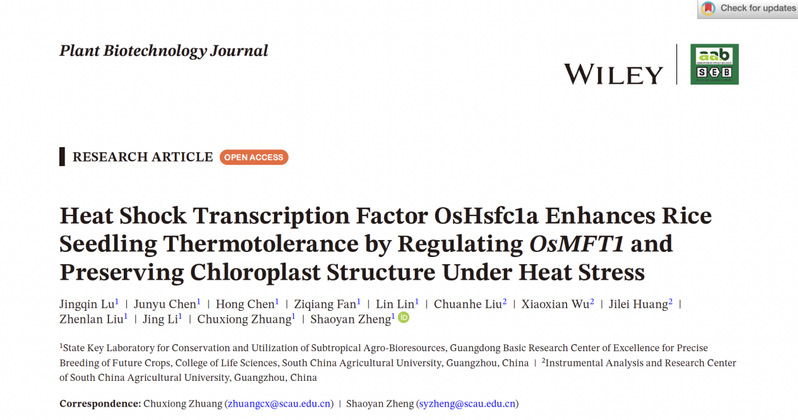近日,華南農(nóng)業(yè)大學(xué)生命科學(xué)學(xué)院、廣東省高等學(xué)校未來作物精準(zhǔn)育種基礎(chǔ)研究卓越中心莊楚雄/鄭少燕團(tuán)隊(duì)在中科院一區(qū)Top期刊Plant Biotechnology Journal上發(fā)表了題為 “The heat shock transcription factorOsHsfc1a enhances rice seedling thermotolerance by regulatingOsMFT1 and preserving chloroplast structure under heat stress ”的論文。該研究成功鑒定了一個(gè)關(guān)鍵的熱激轉(zhuǎn)錄因子OsHsfc1a,并深入解析了其通過抑制下游靶基因OsMFT1以維持葉綠體結(jié)構(gòu)完整性、從而增強(qiáng)水稻幼苗耐熱性的全新分子通路。這一發(fā)現(xiàn)不僅深化了我們對植物應(yīng)對高溫脅迫的理解,更為培育高產(chǎn)、穩(wěn)產(chǎn)、耐熱的水稻新品種提供了寶貴的基因資源和理論依據(jù)。