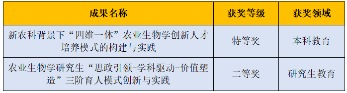我院主持的《新農(nóng)科背景下“四維一體”農(nóng)業(yè)生物學(xué)創(chuàng)新人才培養(yǎng)模式的構(gòu)建與實(shí)踐》榮獲本科教育領(lǐng)域特等獎(jiǎng),這是我院繼2021年獲得廣東省本科教育教學(xué)成果獎(jiǎng)特等獎(jiǎng)以來(lái)再次榮獲特等獎(jiǎng)。《農(nóng)業(yè)生物學(xué)研究生“思政引領(lǐng)-學(xué)科驅(qū)動(dòng)-價(jià)值塑造”三階育人模式創(chuàng)新與實(shí)踐》榮獲研究生教育領(lǐng)域二等獎(jiǎng)。
