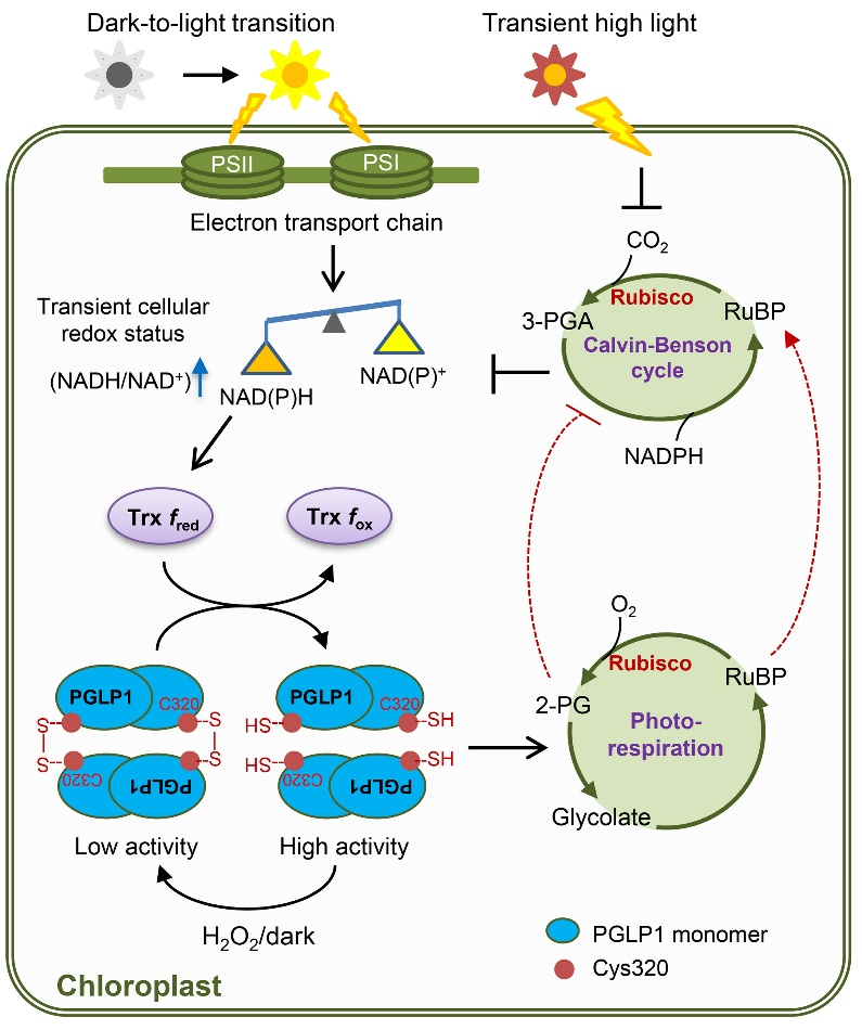 已有研究顯示,光依賴的蛋白質(zhì)氧化還原修飾可精細調(diào)控光合電子傳遞、卡爾文循環(huán)、ATP和葉綠素合成等多個光合相關(guān)過程。本研究揭示了一種由Trx介導(dǎo)的光依賴型PGLP1氧化還原調(diào)控新機制(圖1),將光呼吸整合到植物響應(yīng)光環(huán)境變化的整體代謝網(wǎng)絡(luò)中。該機制有助于保障葉綠體內(nèi)多種代謝過程的協(xié)同進行與能量的有效利用。研究結(jié)果也為通過遺傳改良光呼吸關(guān)鍵酶、提高作物光能利用效率提供了新思路。